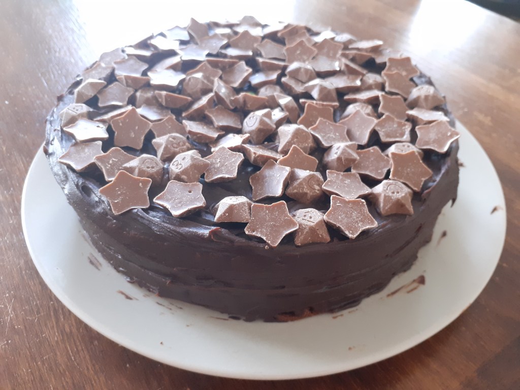 Ice once cool with the chocolate glaze below. It’s the best chocolate icing ever. And no clouds of icing sugar to contend with. This quantity will ice the cake above, with enough to sandwich between the 2 cakes as well as coating the top and sides.